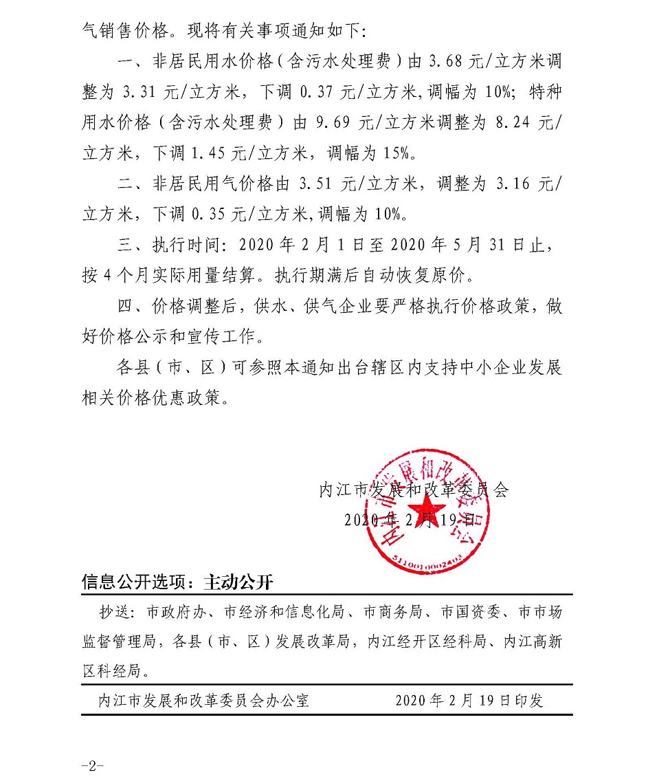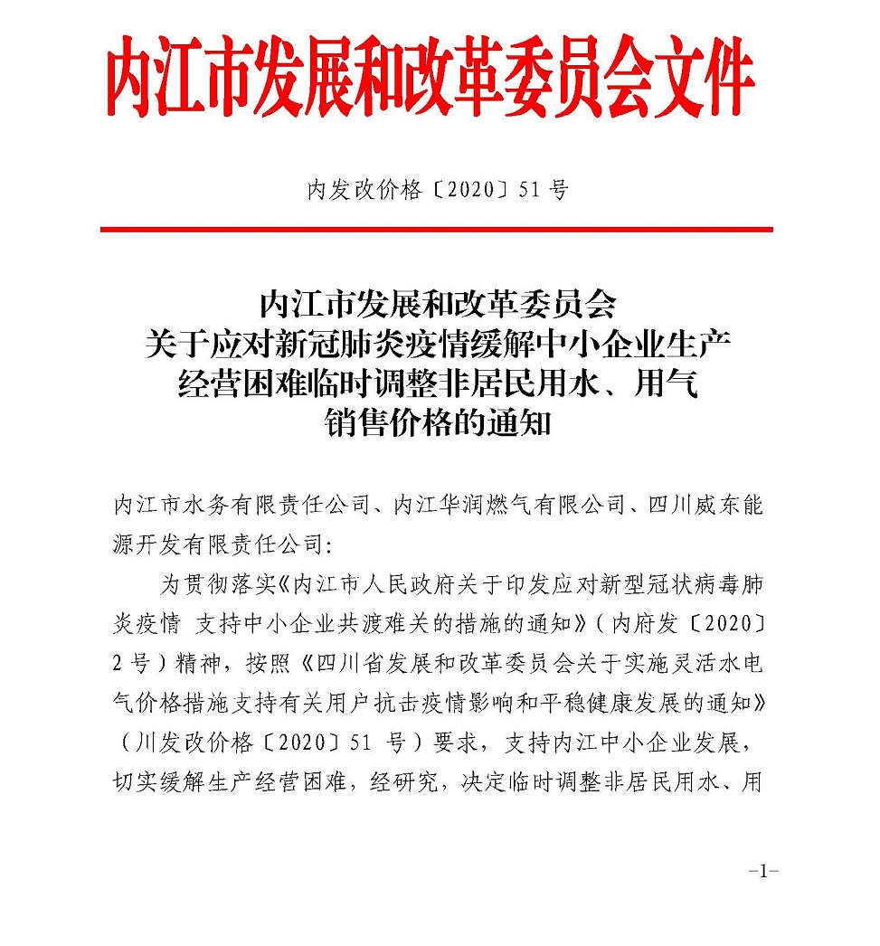內(nèi)江市發(fā)展和改革委員會(huì)關(guān)于應(yīng)對(duì)新冠肺炎疫情緩解中小企業(yè)生產(chǎn)經(jīng)營(yíng)困難臨時(shí)調(diào)整非居民用水、用氣銷(xiāo)售價(jià)格的通知