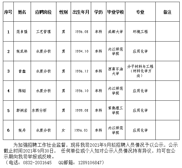 內(nèi)江市水務(wù)有限責(zé)任公司2021年9月擬招聘人員公示