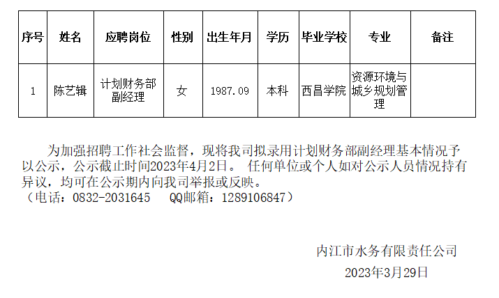 內江市水務有限責任公司擬錄用計劃財務部副經理公示