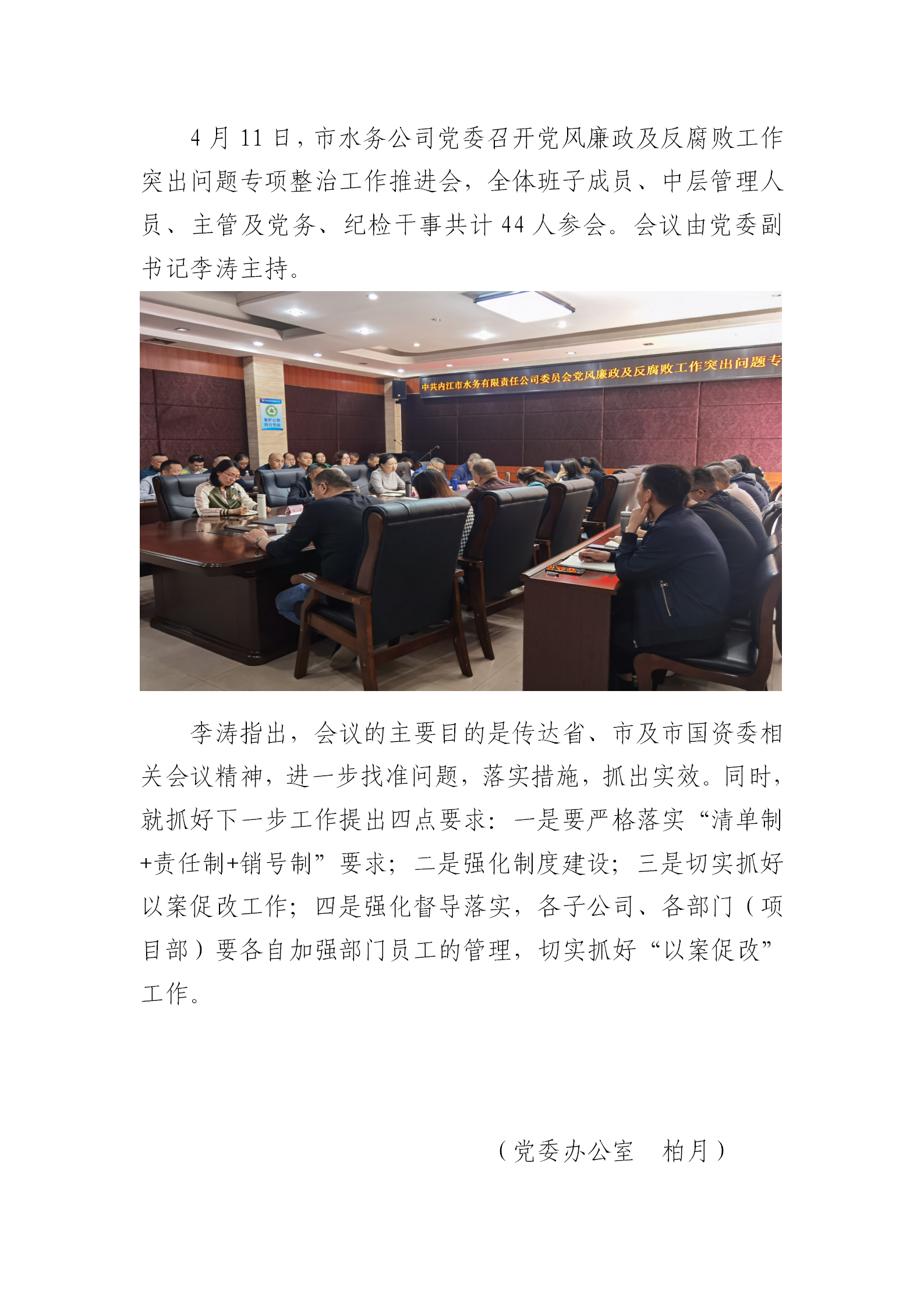 市水務(wù)公司召開(kāi)黨風(fēng)廉政及反腐敗工作突出問(wèn)題專(zhuān)項(xiàng)整治工作推進(jìn)會(huì)