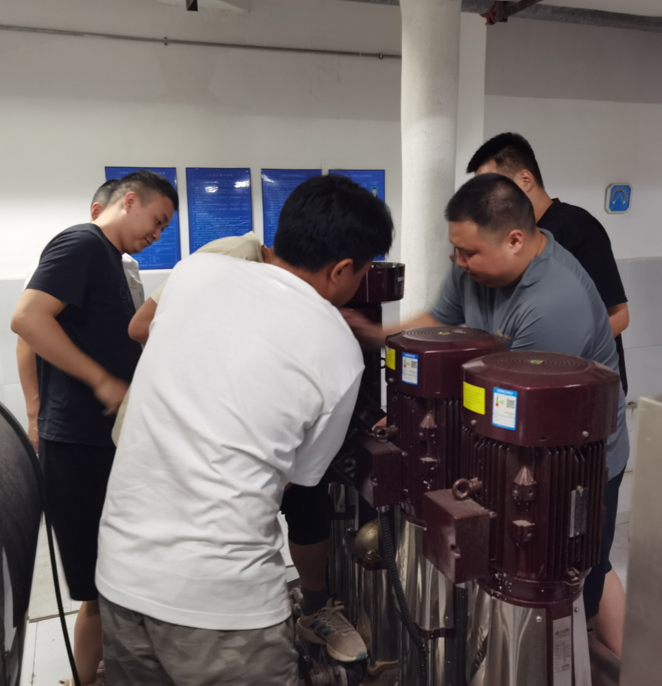 6月中旬,該小區(qū)有用戶反映水壓不穩(wěn)定。豪鵬二次供水公司收到信息立即組織人員前往現(xiàn)場排查,確認(rèn)是一臺水泵電機出了故障,引發(fā)電壓波動所致。面對突發(fā)情況,公司迅速響應(yīng),立即組織人員對故障電機進(jìn)行拆解維修。6月17日下午,維修工作進(jìn)入電機重新安裝的關(guān)鍵階段,公司抓住這次實戰(zhàn)機會,組織5名青年員工參與到此次技術(shù)練兵。通過此次培訓(xùn),員工們不僅掌握了電機維修與安裝的相關(guān)理論和維護(hù)技巧,更在實戰(zhàn)中深化了對二次供水設(shè)施運行原理的理解。